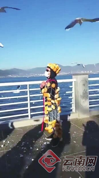 原标题:全身裹满面包 滇池大坝招摇 辣瞎游客眼睛 吓坏海鸥的心