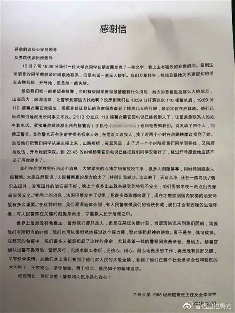 12月12日,迪庆州香格里拉市公安局的蜀黍们被一封感谢信暖到了,原来,这是他们帮助过的兰州大学1988级细胞班班主任及同学们寄来的。