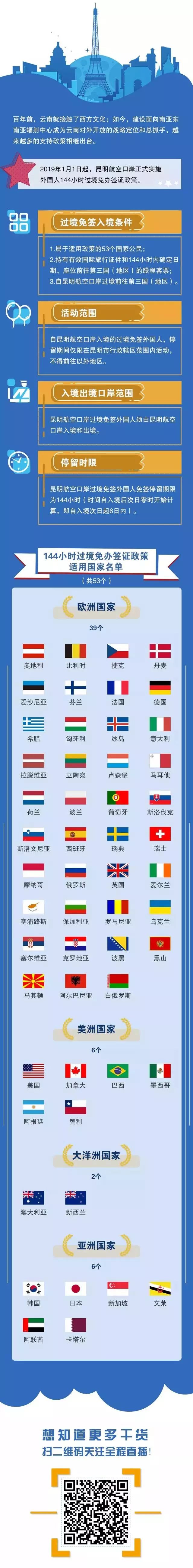 按照国务院、国家移民管理局有关要求,省公安厅牵头推动“外国人144小时过境免签”政策落地。在省外办、省文旅厅、云南机场集团等单位的密切配合下,不断加强口岸软硬件基础设施建设、完善政策保障措施,经报国家移民管理局同意,将于2019年1月1日起,昆明航空口岸对持有有效国际旅行证件和144小时内确定日期、座位前往第三国(地区)联程票的53个国家公民,实行过境免办签证政策,过境免签期间活动范围限定在昆明市行政区域内。这53个国家包括欧洲的奥地利、比利时等39个国家,美洲的美国、巴西等6个国家,大洋洲的澳大利亚、新西兰2个国家,亚洲的韩国、阿联酋等6个国家。
