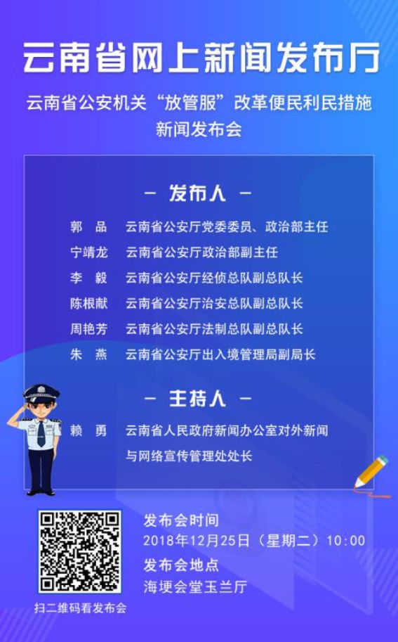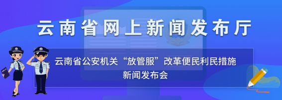 近期,云南省公安厅聚焦人民群众办事创业中的“难点”“堵点”问题,推出云南省公安机关第二批“最多跑一次”事项清单、公安自助便民服务超市、外国人144小时过境免签证政策、“云南公安执法公开信息查询系统”、服务和保障民营经济发展15条措施等五项“放管服”改革措施,并于12月25日,召开新闻发布会,集中进行发布。