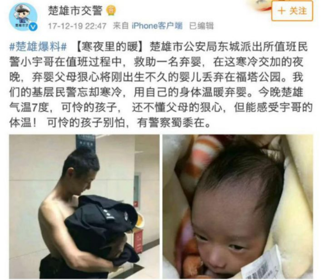 那天傍晚,派出所接到报警:在楚雄市一公园后山树林里有一弃婴,民警赶到现场后,摸黑在树林里找了好长时间,是个男孩儿。他已经四肢冰冷、嘴唇发青,身上唯一的小毛毯已经被他踢开,“小宇哥”没有多想,迅速脱下身上的警服,包裹在孩子身上为他取暖,并迅速把他送到医院进行救治。