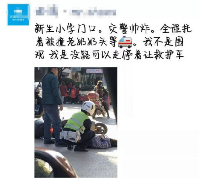 2018年10月31日,曲靖市公安局麒麟分局交警大队民警陈伟、谭新巡逻至三江大道新生小学门口处时,发现一位老奶奶被一名骑电动车的男子撞倒在地。陈伟一边向大队指挥中心报告情况,一边俯下身子询问老奶奶伤情,他将老人头部轻轻托起,蹲在地上一边安抚老人,一边联系老人家属,直到救护车赶到……