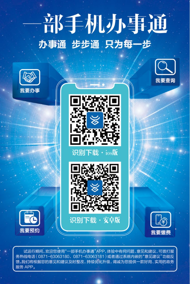 在试运行阶段,群众、企业可以在各地实体政务大厅、建行营业网点等扫描二维码下载(详见“一部手机办事通”APP下载使用简要说明,附后),目前使用安卓系统的手机用户可从应用商店下载云南“一部手机办事通”APP。省政府相关人士表示,广大群众、企业在使用“一部手机办事通”APP过程中有何问题、意见和建议,均可拨打服务热线电话(0871-63063180、0871-63063181)进行反映沟通;同时,通过“一部手机办事通”APP系统内嵌的“问卷调查”功能反馈,从注册、认证、操作、办事、服务等方面,提出改进意见和建议。今后,项目组将结合上线试运行情况,推动系统持续优化升级,力争给群众、企业推出一款好用、实用的政务服务APP。