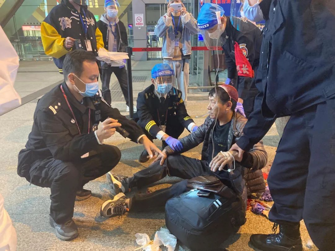 11月1日19时15分,带班领导宋嵘在巡逻中接到报警求助,B1层3号门处有旅客晕倒。巡逻民警第一时间赶至现场。旅客躺在地上,地上有大量血迹。宋嵘立即组织民警维持现场秩序的同时协助在场医护人员对旅客进行救助。通过民警与医护人员的共同配合,该旅客脱离生命危险,于19时35分将该旅客送上救护车前往医院救治。