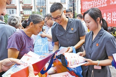 为切实提高群众防骗、识骗、拒骗能力,从源头预防电信网络诈骗案件的发生,营造人人反诈的浓厚氛围,7月5日,广西壮族自治区阳朔县人民法院干警来到高田镇集市开展“反电信网络诈骗”普法宣传活动,持续提升群众的防范意识,帮助群众“守住钱袋子”,切实提升群众安全感、满意度。图为活动现场干警发放宣传资料,向群众讲解常见电信网络诈骗手法并解答疑问。黎樱芳 摄