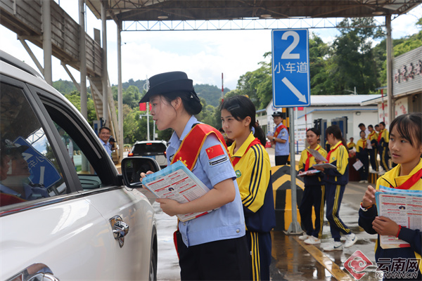 “叔叔、阿姨,这份禁毒宣传单请收好,上面画的都是毒品,千万不能碰!看到有人吸毒也要记得举报啊。”执勤点上,党员先锋队队员、移民管理警察与天伟小学的孩子们并肩作战,热情地将图文并茂的宣传资料递到过往旅客手中。