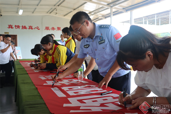 在禁毒倡议横幅上,全体参与人员郑重签名,庄严作出禁毒承诺:坚决抵制毒品危害,积极参与禁毒斗争,共同筑起抵御毒品的坚实屏障。