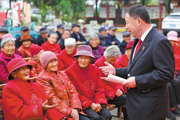 10月26日,山东省枣庄市市中区人民法院组织法官走进乡村开展敬老迎重阳主题活动,向老年人进行普法宣传,使其感受到法治的关怀,弘扬尊老敬老传统美德,营造关爱老年群体的社会氛围。图为法官在孟庄镇大郭庄村向老年人宣传法律知识。