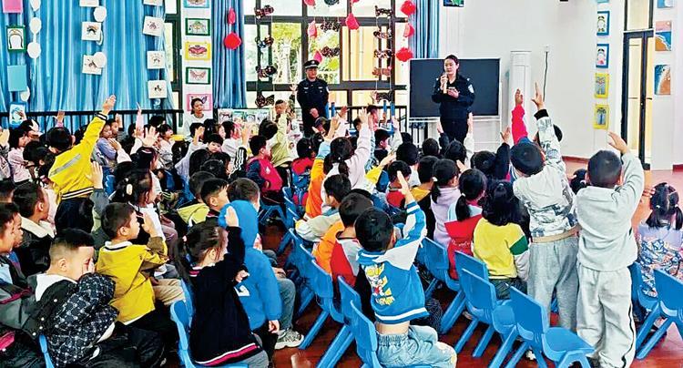 在巧家县金塘镇,巧家县公安局女警护苗志愿行动队与金塘派出所民警走进巧家县天生幼儿园、金塘镇中心幼儿园等,民警摒弃传统说教模式,结合未成年人保护法、预防校园欺凌等内容,将知识从枯燥的课本搬到生动的现实场景中,以现场提问、有奖问答、案例分析、情景模拟等方式,让法治意识深入童心。