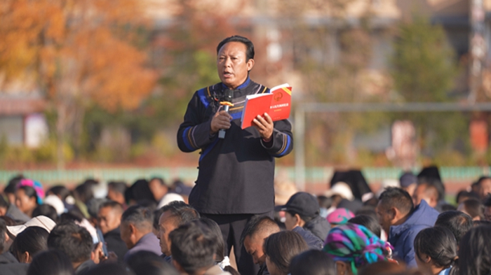 12月3日,在宁蒗县小凉山学校,1500余名师生和家长围坐一堂,聆听“普法阿普”毛建忠用彝汉“双语”讲述法治故事。这是他扎根基层23年来的第1000场宣讲,从木楞房的火塘边到网络上的普法直播间,从田间地头到校园课堂,毛建忠用一句“我要用自己的语言唤醒我的民族”,道出了法治最朴素的价值。