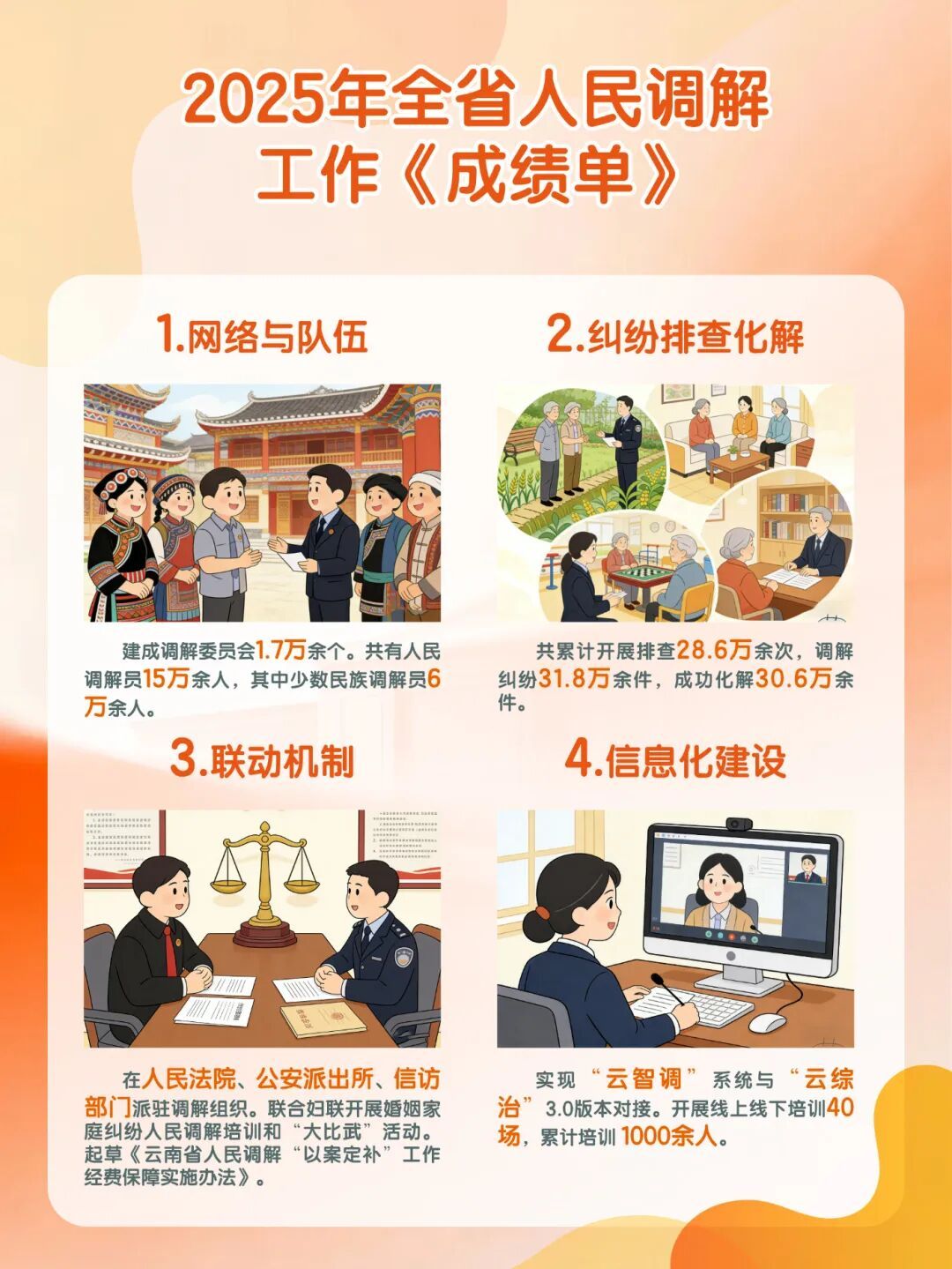 2025年,建成覆盖村(社区)、乡镇(街道)及医疗卫生、道路交通、劳动争议等领域的调解委员会 1.7万余个。共有人民调解员 15万余人,其中少数民族调解员 6万余人。发展专职调解员与“双语”调解队伍,常态化开展业务培训。印发专项通知,依托综治中心统筹律师、公证、法律援助等力量开展矛盾纠纷排查化解。累计开展排查28.6万余次,调解纠纷31.8万余件,成功化解30.6万余件。