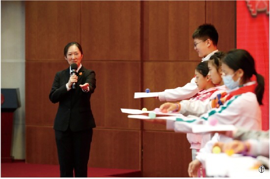 图② 法官秦硕与同学们开展互动小游戏“网络中的TA”,教大家认识网络风险。