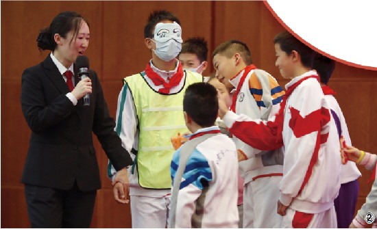 图① 同学们参与白纸运送小球的游戏,理解法律和自由的边界。