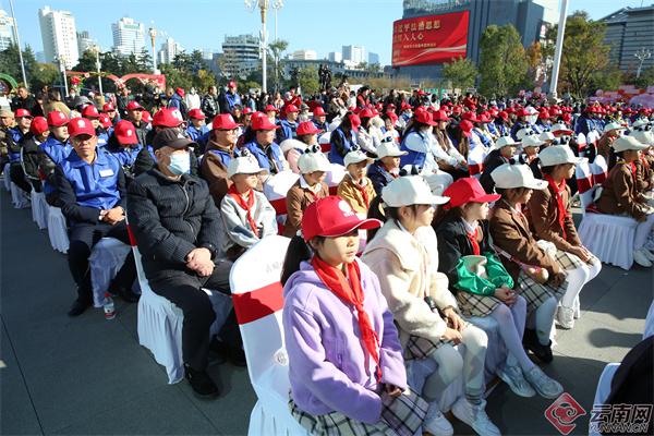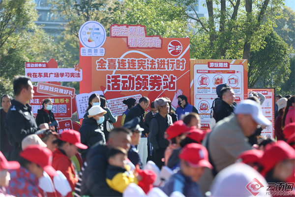 国歌嘹亮,法治同行。12月4日,在第十二个国家宪法日来临之际,云南省2025年“宪法宣传周”暨“12・4”国家宪法日集中宣传活动在昆明市盘龙区东风广场举行。6000平方米的沉浸式法治空间内,古今法治元素交相辉映,民族风情与科技赋能相得益彰,数千名市民群众在庄重而热烈的氛围中,共同感受宪法精神的“时代力量”,见证云南边疆民族地区普法强基的生动实践。