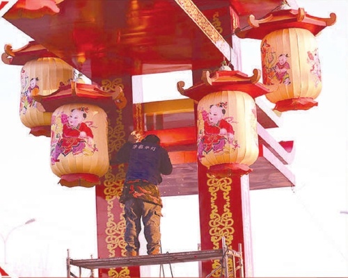 2月11日,杨柳青古镇,工人正在悬挂年画主题的春节花灯。
