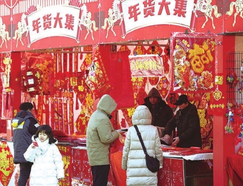 人们在杨柳青古镇年货大集上选购年画、对联、福字。