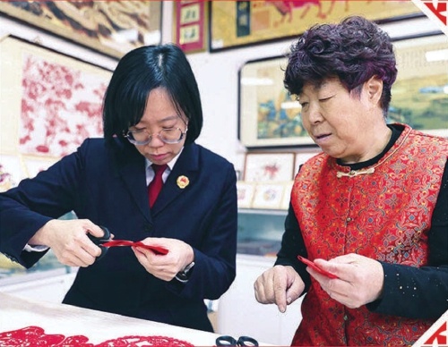 春节前,西青区检察院检察官走访天津市级非物质文化遗产杨柳青剪纸代表性传承人郝桂芬。