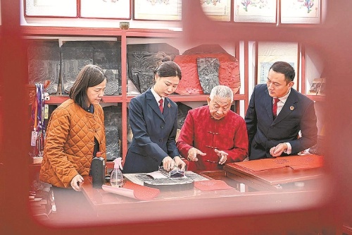 春节前,国家级非物质文化遗产代表性项目杨柳青木版年画传承人张宏(左一)、霍庆顺(右二)向西青区检察院检察官介绍非遗传承情况。