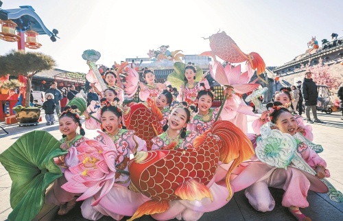 春节前,天津市某国际舞蹈学校的小朋友们在杨柳青古镇广场上,以年画娃娃为造型表演民俗舞蹈。
