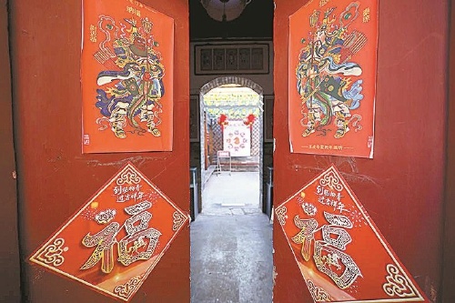春节前,杨柳青古镇里,家家户户的大门上都贴着年画和福字。