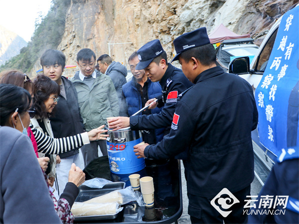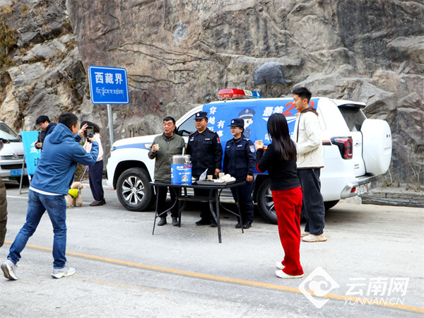 除了送上热姜汤,他还为游客发放定制法律宣传钥匙扣,在送上新春祝福的同时,普及边境管理、交通安全、反诈防范等知识,让法治宣传融入旅途点滴。他同步提供路线指引、高原安全提醒、应急药品补给等便民服务,把警“茶”车打造成过往旅客心中最安心、最温暖的旅途港湾。